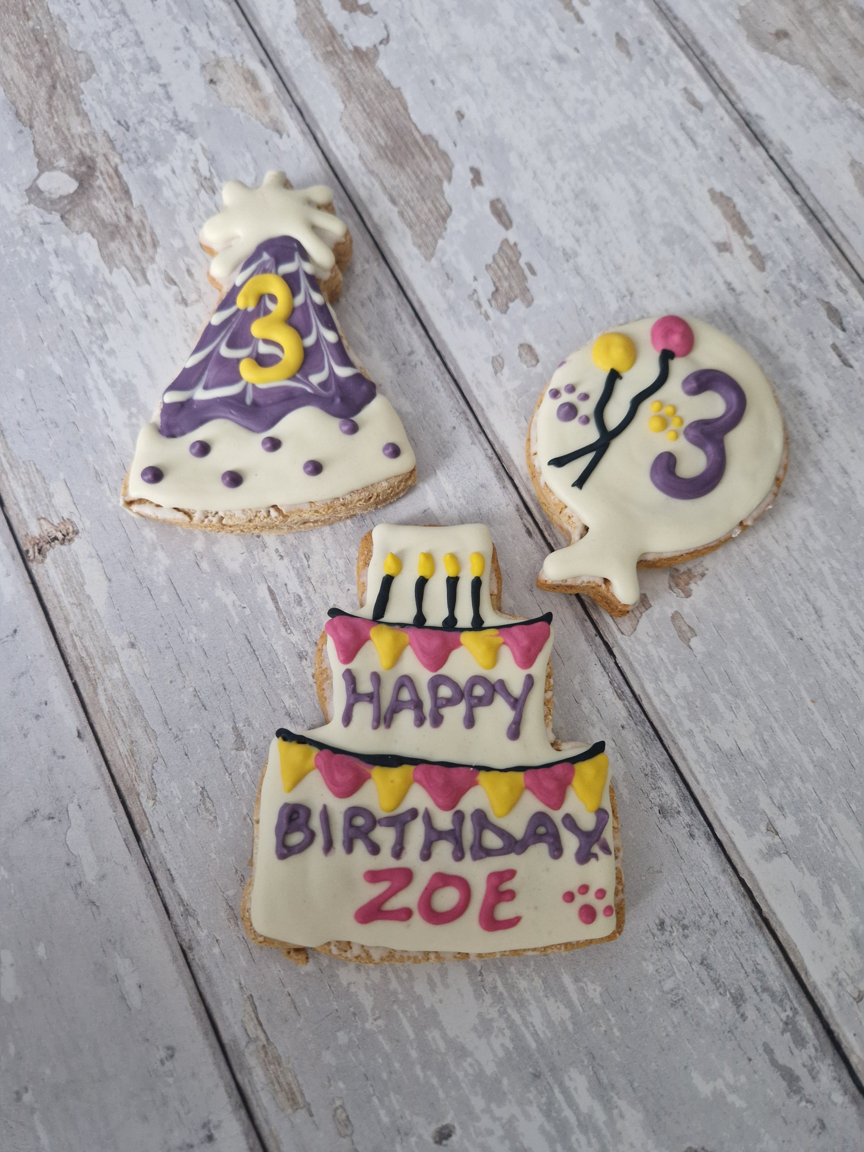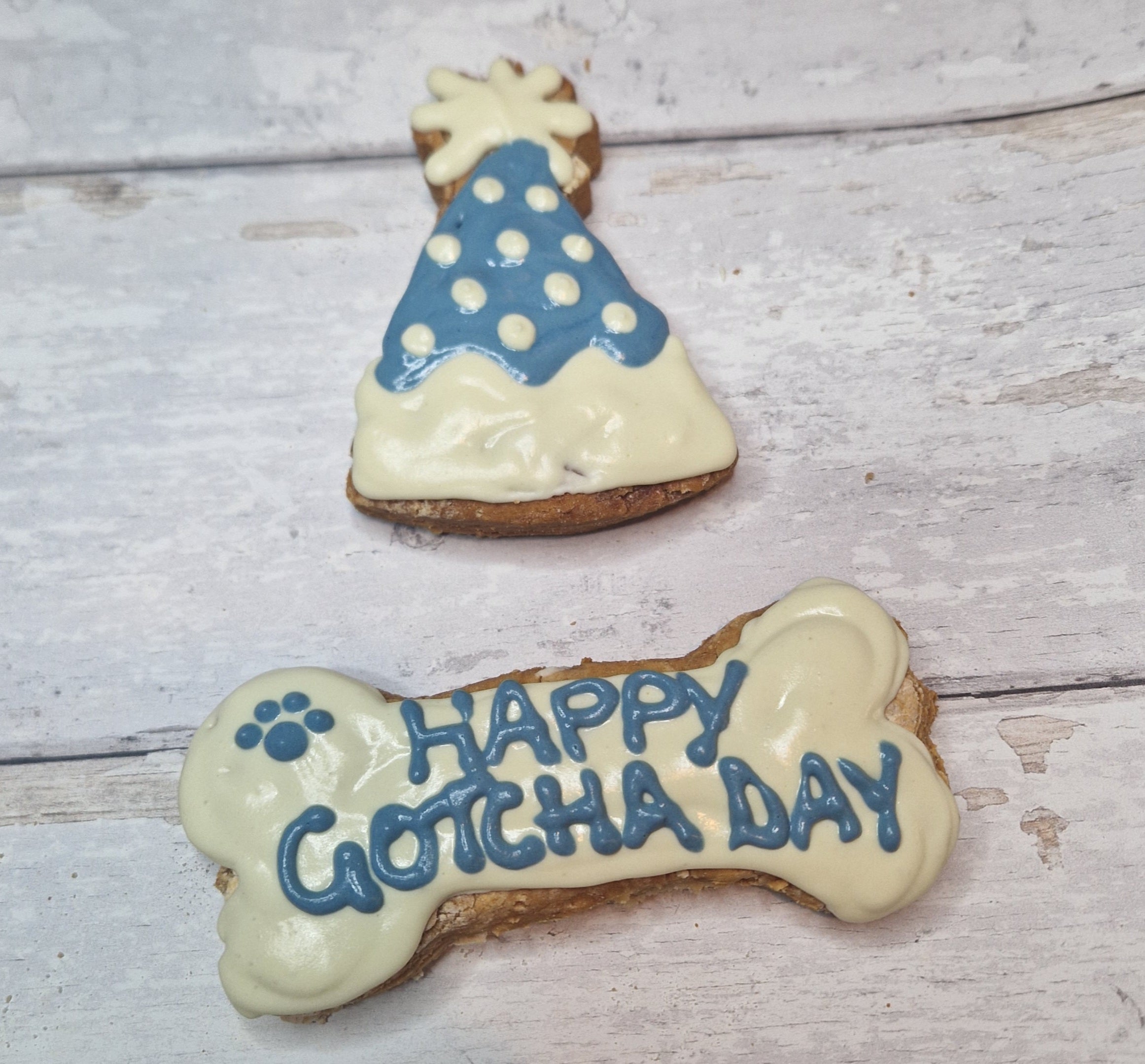 Our Personalised Birthday Box will make your Dogs birthday extra special. We offer a wide range of birthday themed treat boxes & cakes. We offer three different doggie birthday cakes with different themes. We also offer persronalised and non personalised birthday iced treats with choice of colour scheme.