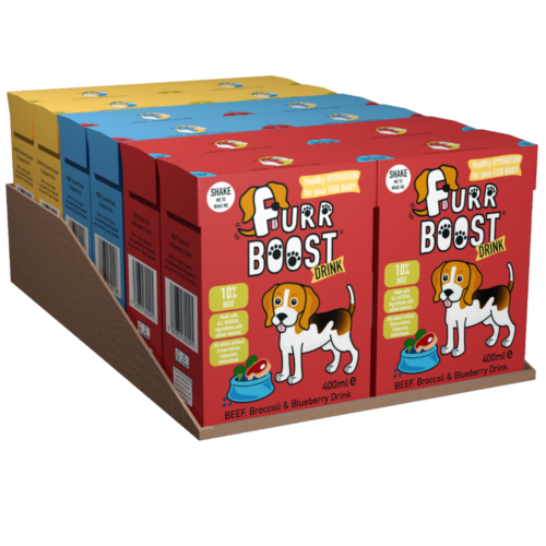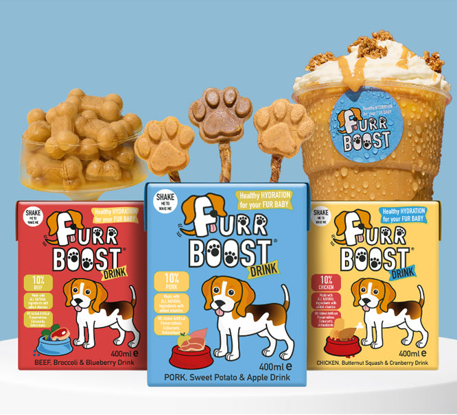 Furrboost Broth Hydration Drink Made with human-grade ingredients, using the best quality meat, veg, fruit, added oils and vitamins, in flavours we know they’ll love! Take it on your walk, drizzle over their favourite food, freeze it to make pupsicles or make a tasty puppuccino after a ruff day.