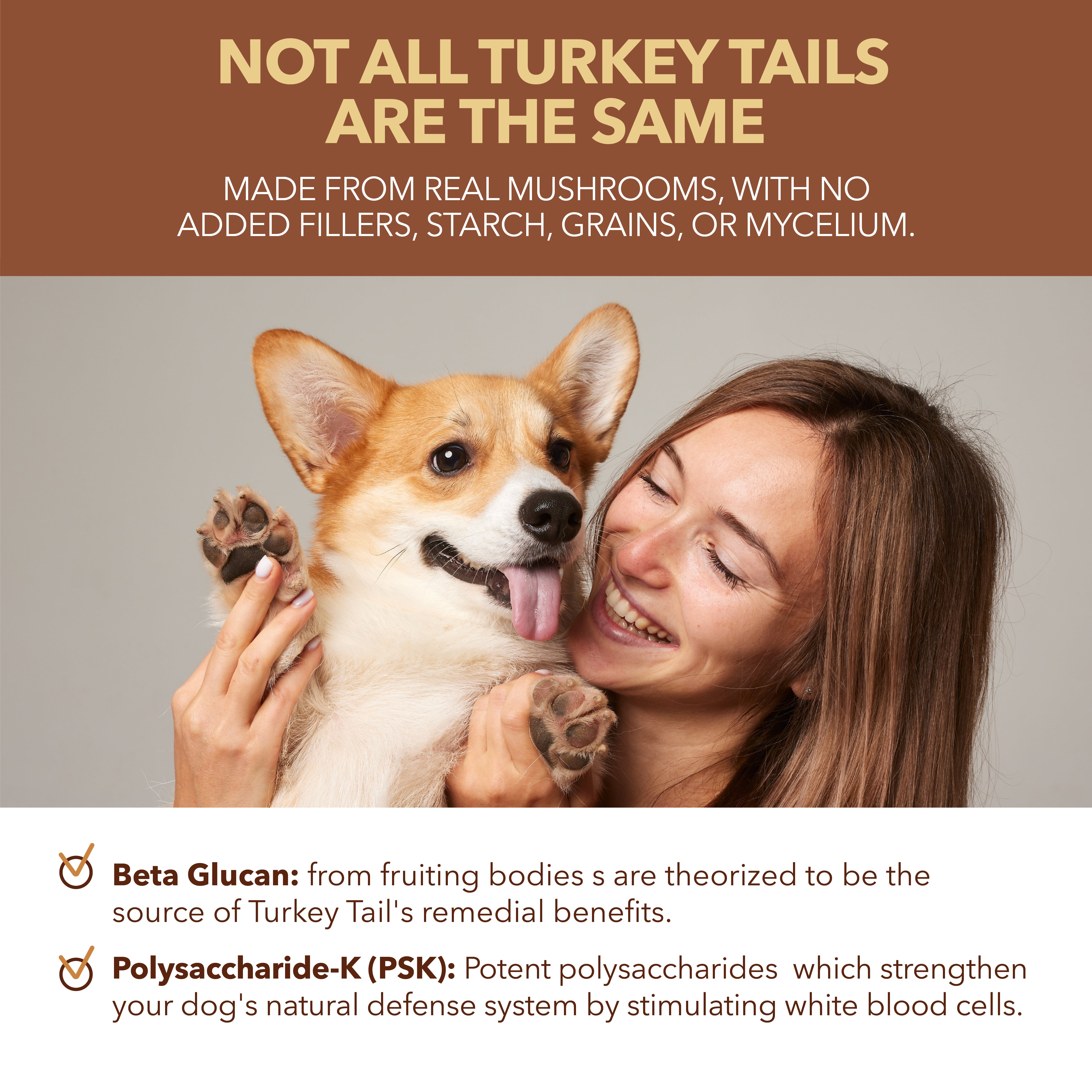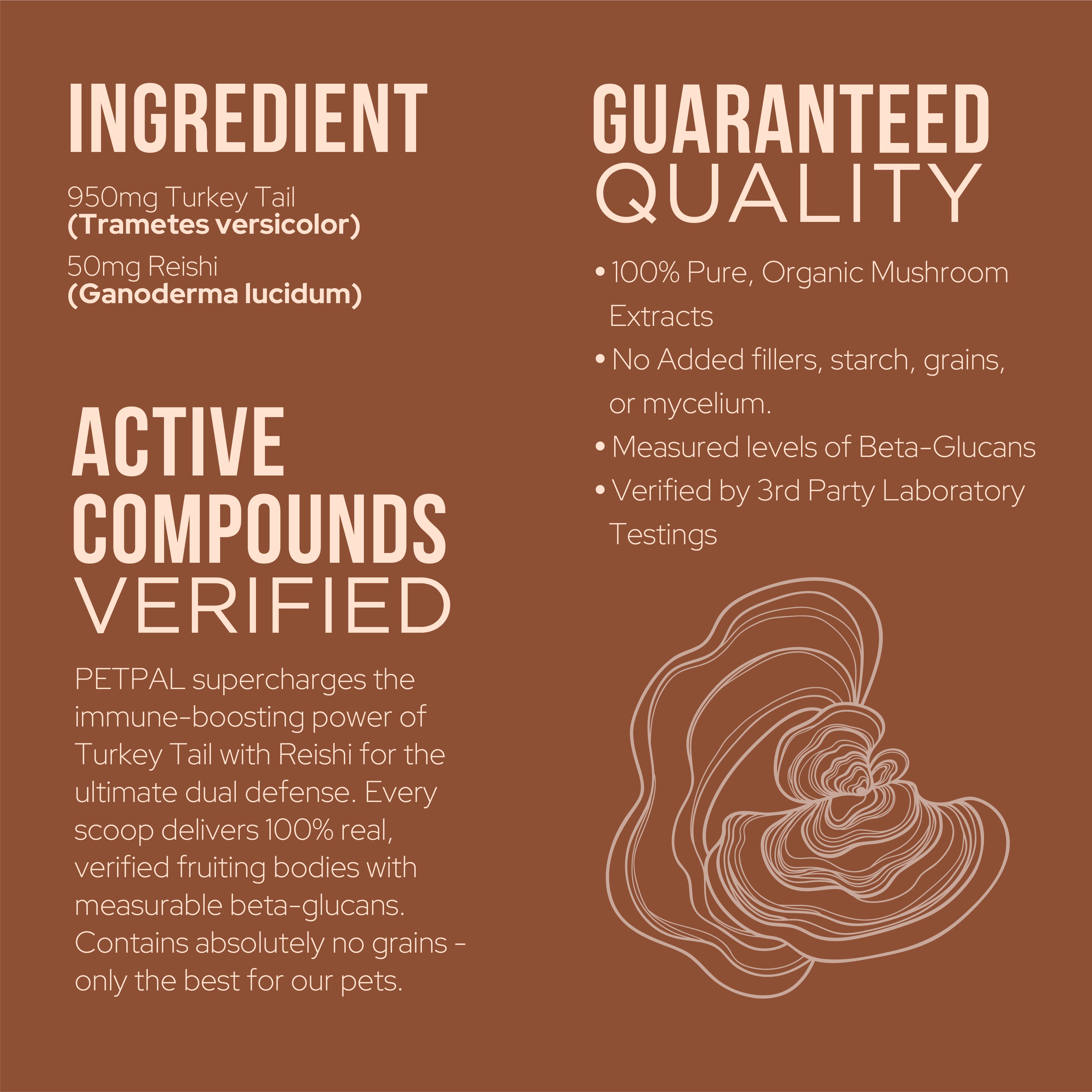 The "King of Mushrooms." We added a touch of Reishi to promote longevity and whole-body balance. While Turkey Tail focuses on defense, Reishi is a powerful adaptogen that helps the body cope with physical stress. It contains natural triterpenes to support healthy liver function and cardiovascular wellness, ensuring your pet stays as calm as they are strong.