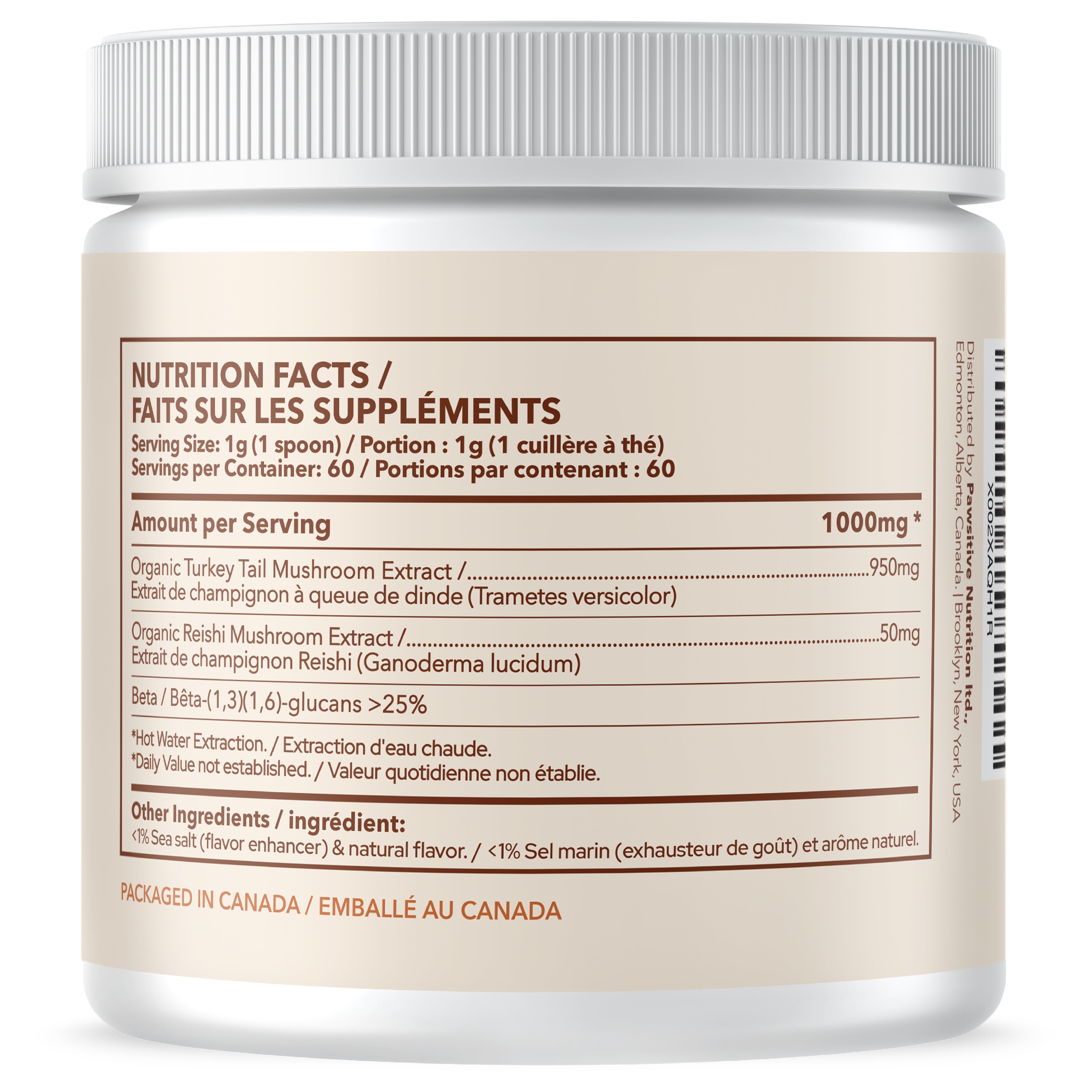 Organic Turkey Tail Mushroom Extract (Trametes versicolor), Organic Reishi Mushroom Extract (Ganoderma lucidum), <1% Natural Flavor, and sea salt.