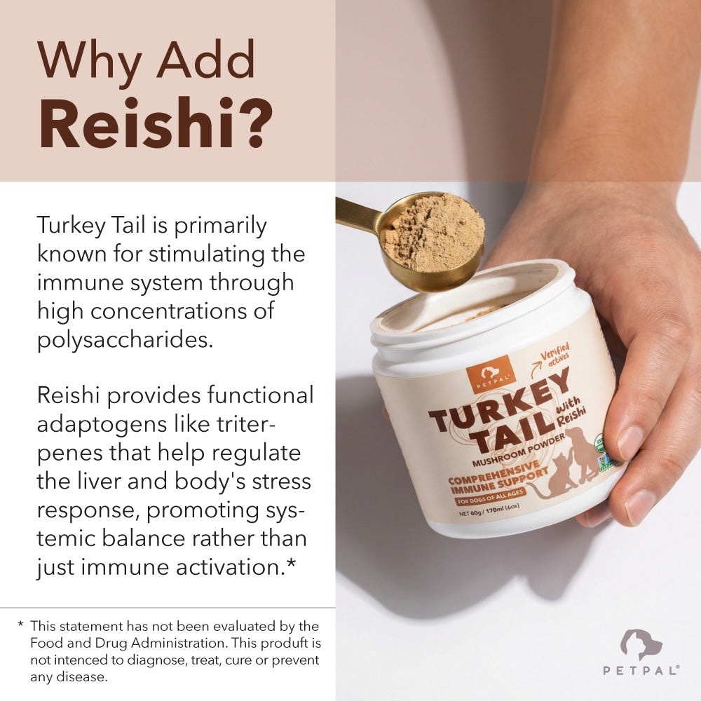 From the forest floor to your pet's bowl, nature provides the best defense. We’ve bottled the power of the world’s most researched functional mushroom, Turkey Tail and paired it with the legendary Mushroom of Immortality, Reishi. This isn't just a supplement; it’s a daily bodyguard for your pet’s health. Whether you are supporting a senior dog through a health challenge or simply want to future-proof a younger pup, this blend delivers a potent dose of beta-glucans to train their immune system to be smarter, stronger, and ready for anything.
