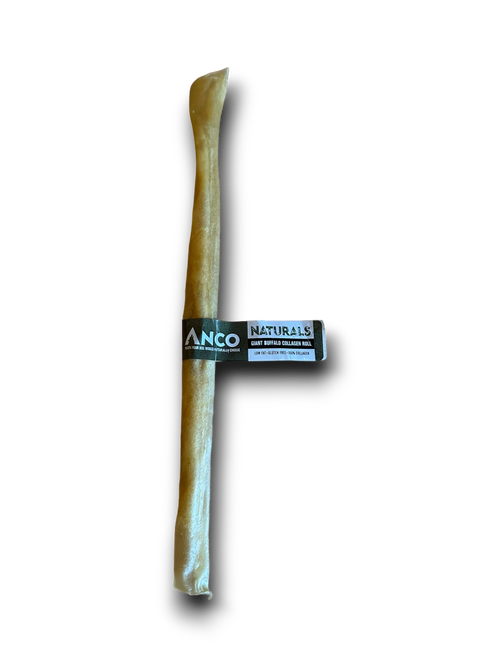 This 100% pure Collagen Roll has an irresistible flavour and satisfying texture. Collagen has many benefits for dogs, making Anco Giant Buffalo Collagen Rolls a great healthy option for your dog. Collagen helps to promote healthy Bones, Muscles, Tendons, Ligaments, Skin, fur and nail growth! As well as, Collagen also aids joint pain and digestive health. Chewing down on these healthy treats also helps keep their teeth nice and clean and keeps them entertained. Due to the size of these giant treats, they are an excellent choice if your dog is an enthusiastic chewer