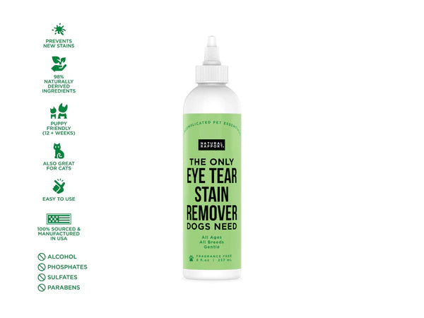 The eyes have it: crust, staining, and build up! But don't you worry, we got them covered. Not only does our Eye Tear Stain Remover work & work well removing build up & stains caused by tears, saliva & mucus, but what truly makes our Eye Tear Stain Remover different is this: our formulation is gentle for even the most sensitive pet; and without any harsh chemicals in the mix, you can safely use liberally on your pet’s eyes, nose and mouth.