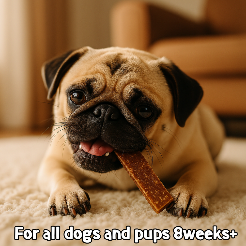 Complementary treats for adult dogs and puppies over the age of 8+ weeks. Not intended as a meal replacement. Always have drinking water available. 1 stick per day for medium dogs 10-25kg. For smaller dogs, break stick in half.