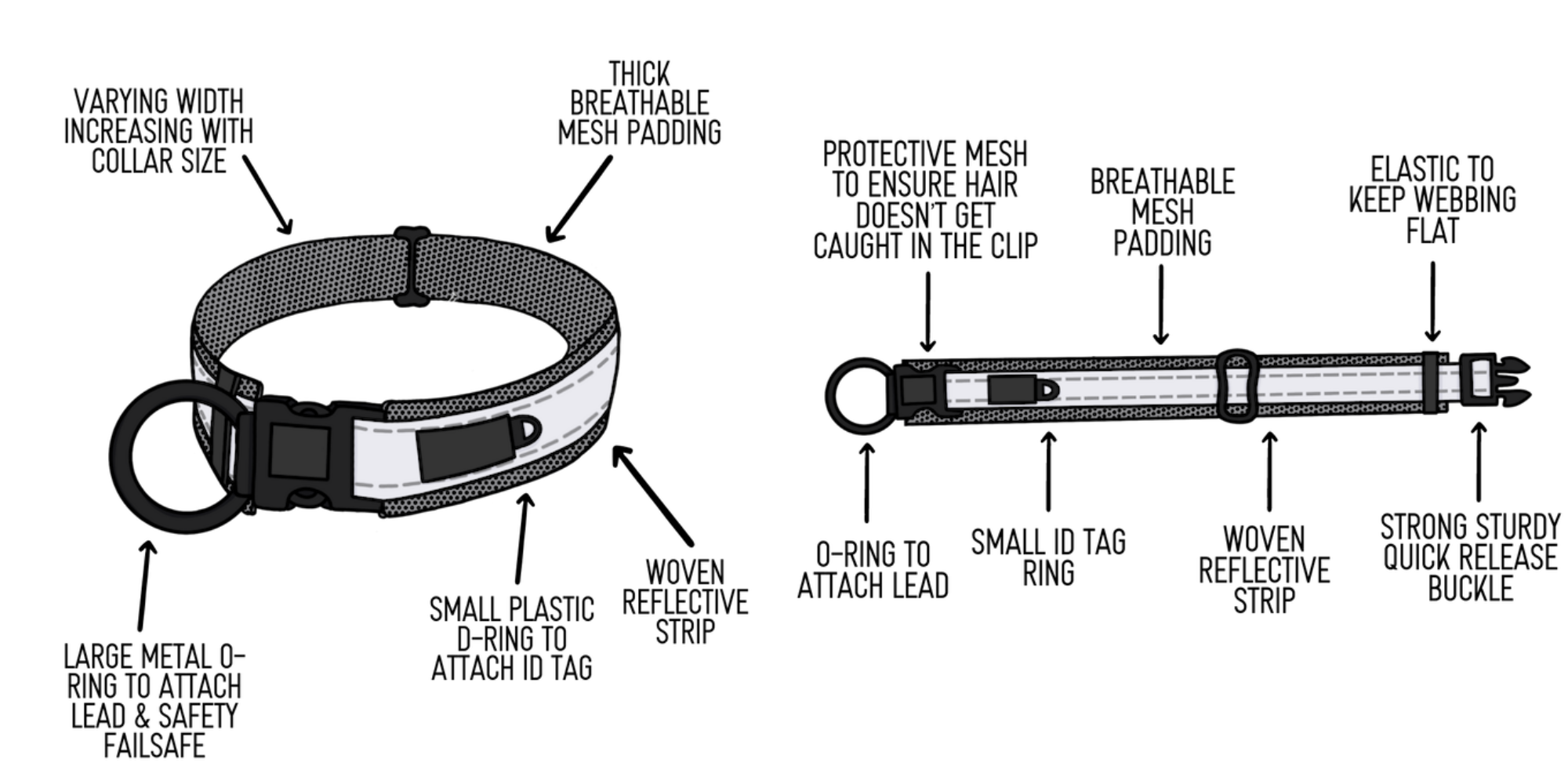 brand new innovative padded and weatherproof Adventure Collars are perfect for everyday wear. The light mesh padding is comfortable for your dog and dries quickly, perfect for every adventure from quick strolls around the block to big swims or bagging summits. Each collar has a reflective strip all around to ensure visibility in low light, and has a unique failsafe O-ring for added security.